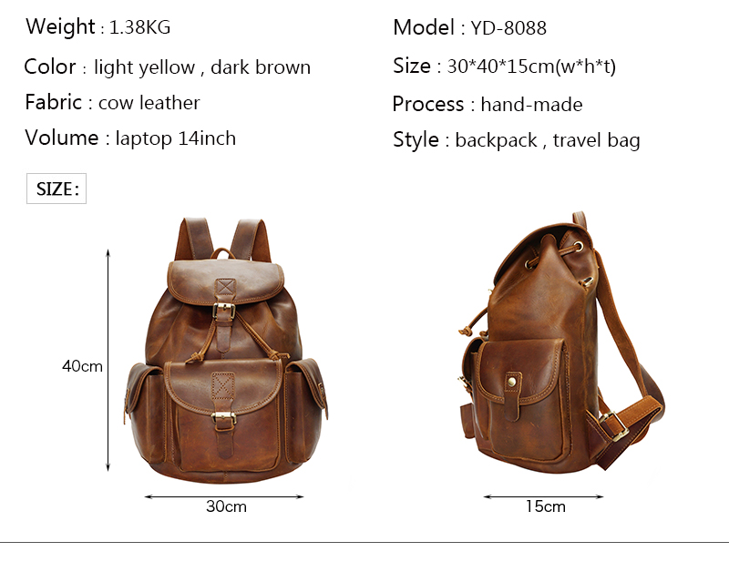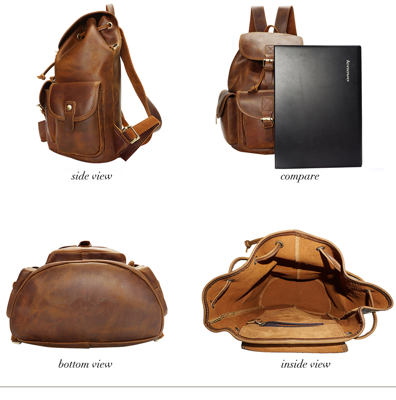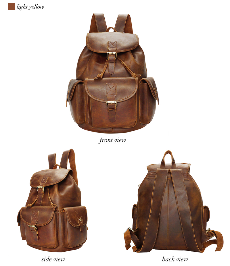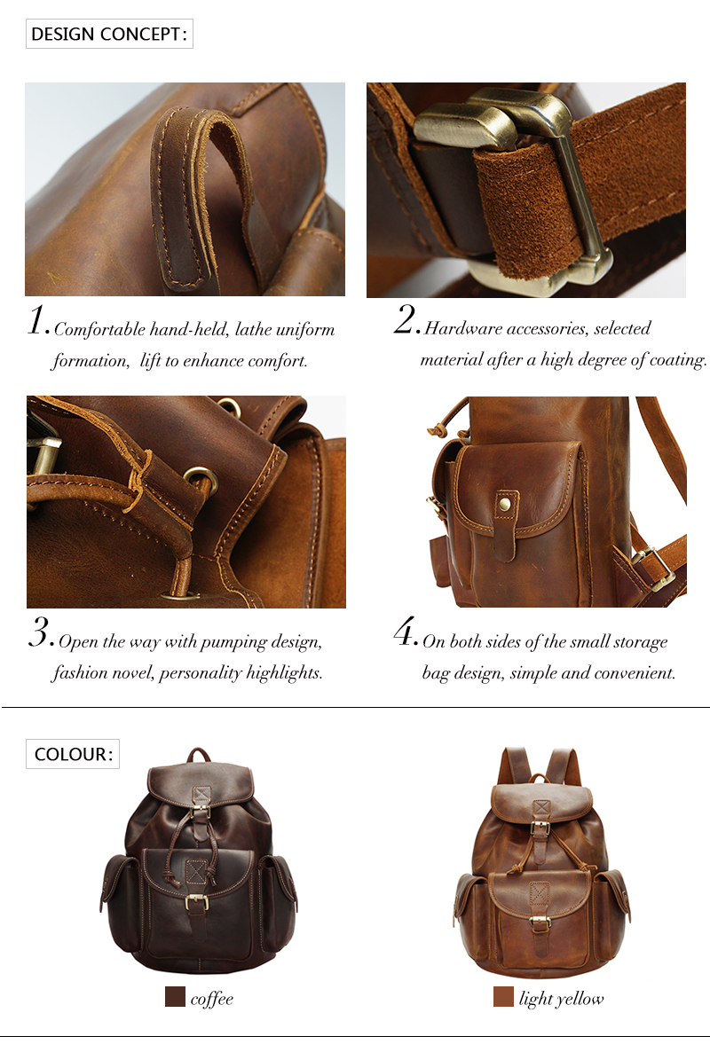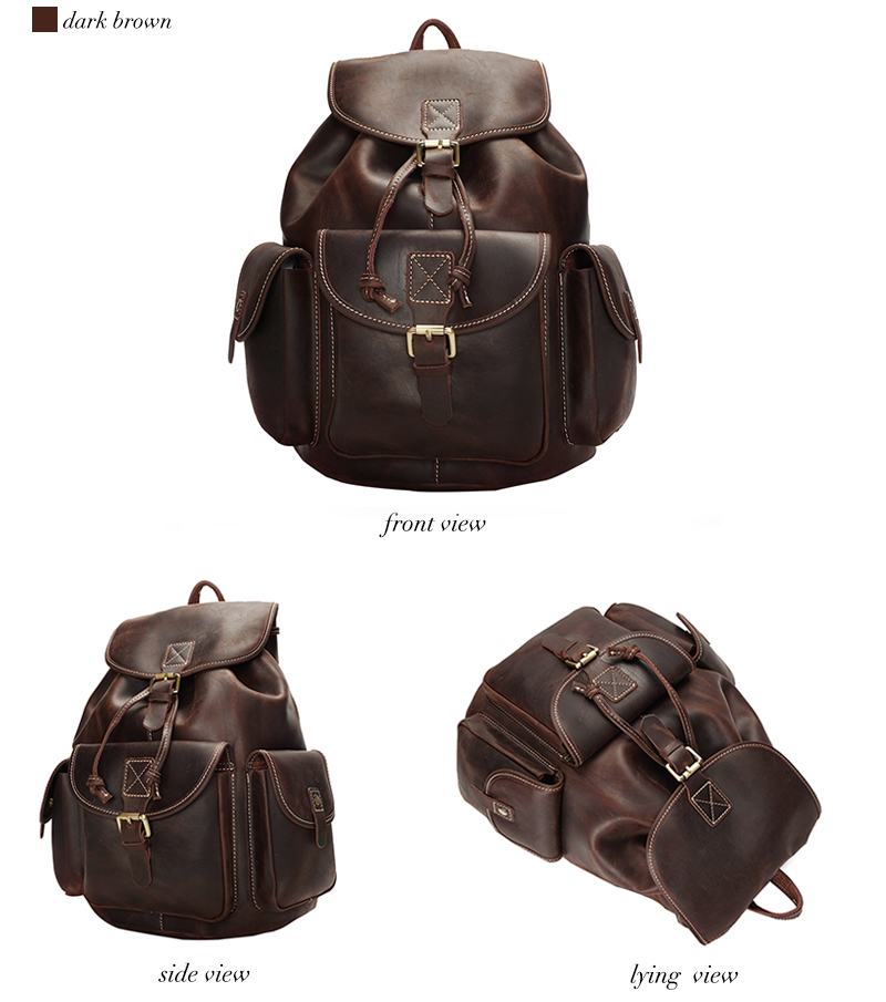 This Crazy horse cowhide leather backpack is suitable for outdoor tarveling . This bag is made of top layer cowhide material, showing an eternal and retro appearance, which will only get better and better with time. The spacious interior space is equipped with multiple compartments to keep your things in order, and the adjustable shoulder strap ensures comfortable carrying. With its sturdy structure and classic design, this backpack is an ideal choice for work, travel or daily use.